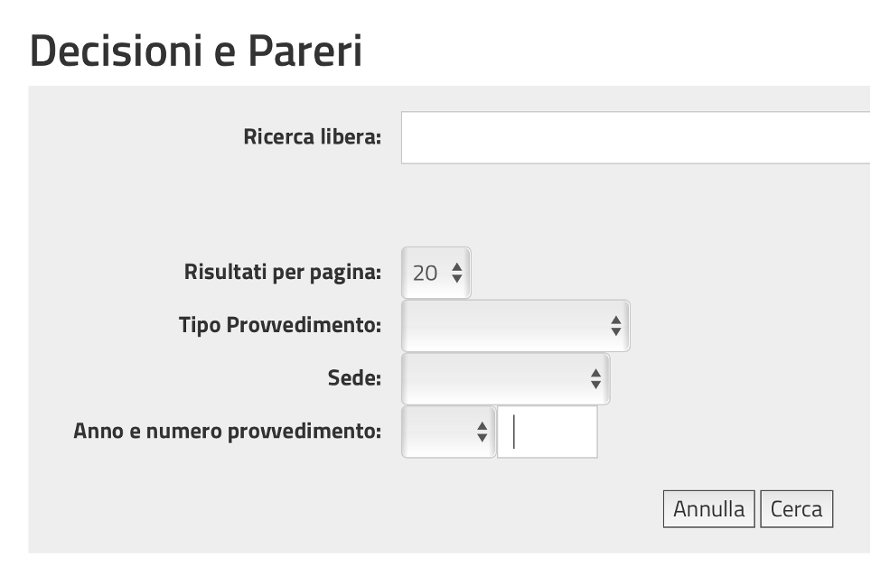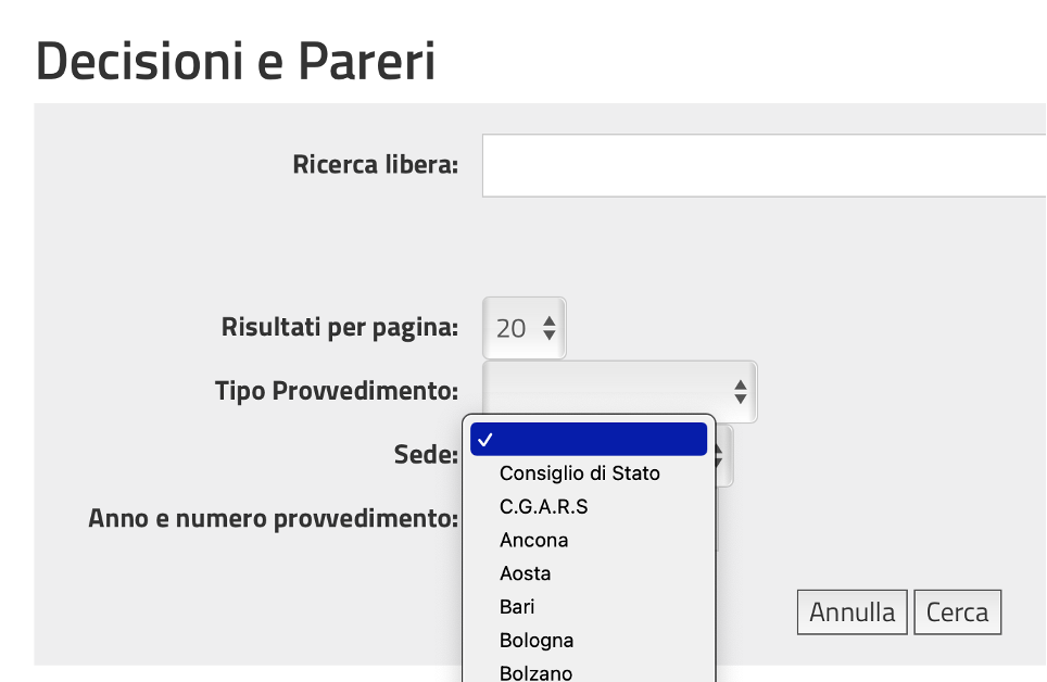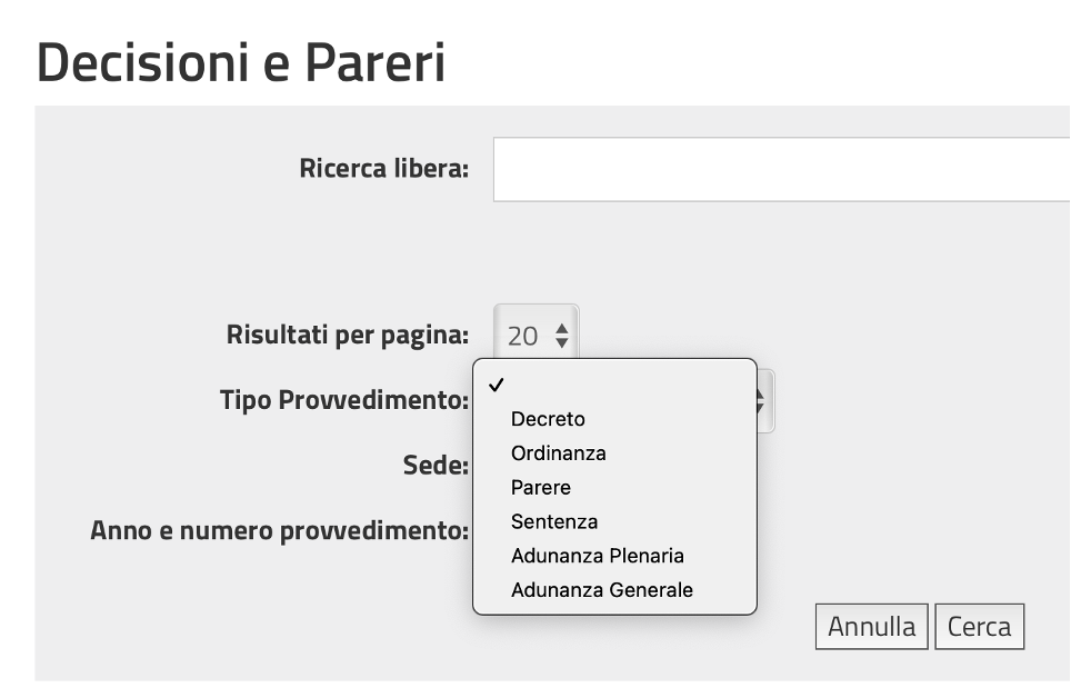 Deve essere valorizzato nel menù a tendina il tipo di provvedimento (sentenza, ordinanza…etc.) tenendo presente che le sentenze dell’Adunanza plenaria e dell’Adunanza Generale vanno selezionate in questo gruppo, e non ricercate frale altre sentenze del Consiglio di Stato.